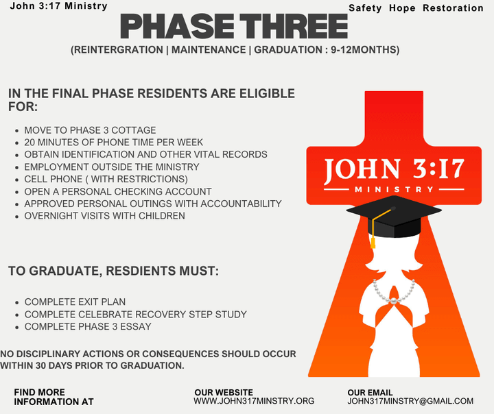 HE FINAL PHASE FOCUSES ON PREPARING RESIDENTS TO REINTERGRATE INTO SOCIETY AND MAINTAIN THEIR NEWFOUND SOBRIETY AND SPIRITUAL GROWTH.